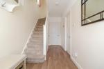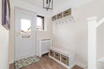 The ground floor opens into a welcoming entrance hallway with Karndean flooring, stairs rising to the first floor, a WC, understairs storage and a fitted shoe/coat cupboard. The spacious lounge is a warm and inviting reception room, centred around an original fireplace and complemented by bespoke fitted cupboards and shelving.