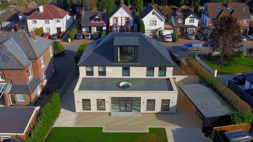 Now priced to sell by Hubbard Torlot - this architectural five bedroom showpiece blends luxury, technology and precision crafted design in a secluded corner of Warlingham. This is a bespoke, fabulously renovated & extended imposing detached home where no leaf has been left unturned and the attention to detail is apparent upon inspection. The many features are countless with quality, bespoke and up to the minute fitments and furniture throughout. 'Olive House' occupies a corner plot positioned on a quiet lane which leads into open fields and pleasant walks. Double sets of sliding electric gates with intercom system provide a secure 'in and out' carriage driveway. Beyond the gates is an impressive driveway finished in permeable resin, secluded by attractive iron fencing and mature laurels. Entrance to the property is via the large, bespoke steel front door with keyless door entry via smartphone, fingerprint and keyless recognition, opening to the most impressive hallway with vaulted ceiling and wonderful bubble chandelier, black wrought iron balustrading with oak handrails glass crittle enclosure to wine store making great use of the understairs area. The reception rooms to this floor are vast and all of fantastic sizing to include an impressive formal lounge with bespoke cabinetry and shelving, recessed tv unit and lighting along with unique arched bio ethanol fireplace. There is a great sized office with attractive bespoke cabinetry. Additional reception room/ground floor bedroom if desired being a fantastic size with underfloor heating and bespoke led ceiling lighting. The hub of the home being an absolute master piece of this fine property is the amazing kitchen/dining/living space, fitted with an individual and bespoke range of 'Nolte' units to include quality 'Siemens' appliances which includes 2 dishwashers, large resin butlers style sink, espresso machine, fridge and freezer, vented induction hob, 2 smart ovens and compact oven with microwave. This room is complemented with recessed quartz lighting, wall lighting and hanging pedants over the large island unit making this an ideal family/entertainment space. To the centre of this room is the impressive dining area with a unique circular roof light with curved bespoke coving complemented with a 'Halo' effect led light. Full height black crittall doors lead to the large entrance hallway. Finally and completing this wonderful room is a calm living area with views over the rear garden enjoying once again bespoke cabinetry, a warm cashmere and walnut veneered wood decor with arched led wall additions. A hidden door leads to a fully fitted pantry which in turn leads through to a wonderful utility room. This room is ready for the family to hide away all those every day items and includes a washer/dryer, ample storage cupboards and also houses the large plant room to include 2 large hot water cylinders enabling all bathrooms to be used at the same time. A turning staircase leads to the first floor landing, comprising black wrought iron spindles, wall and led lighting and luxurious carpet runner. Once on the first floor the light streams in through the large window creating a warm and light ambience. The master bedroom (being one of 2 possibilities) provides bespoke headboard and media wall, walk through to a walk in wardrobe area and access to the impressive en-suite bathroom to include double smoked oak & Carrera marble resin basins with brushed gold sanitary ware and walnut wood cladding to the w.c area as well as marble effect porcelain tiling to the walls. There is a double shower with 'Lusso' fitments to include a brushed gold rainfall shower. Bedroom 2 has recessed fitted wardrobes, with bespoke coiffured ceiling with led lighting and beautiful hanging pendants creating a great Guest Suite as boasts a further en-suite bathroom with Black Stone bath, travertine effect tiling, stone basin and complimenting taps and fitments.